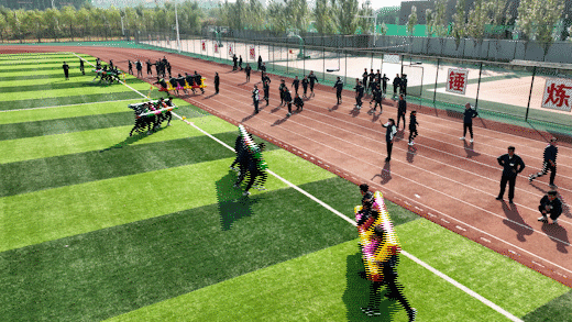 旱地巨龙项目中,运动员共驾“龙舟”,以腿为桨,以手为舵,一条条“巨龙”在运动场上极速前行。